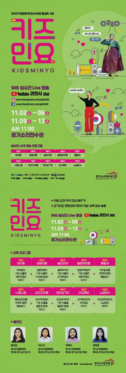 2020년도 무형문화재 전수교육관활성화사업 SNS실시간 라이브방송 ‘키즈민요 KIDSMINYO’ 페이지 정보 작성자 전은정 작성일20-10-26 10:52 조회1,795회 댓글0건 이전글 다음글 목록 본문 1 댓글목록 등록된 댓글이 없습니다. 이전글 다음글 목록