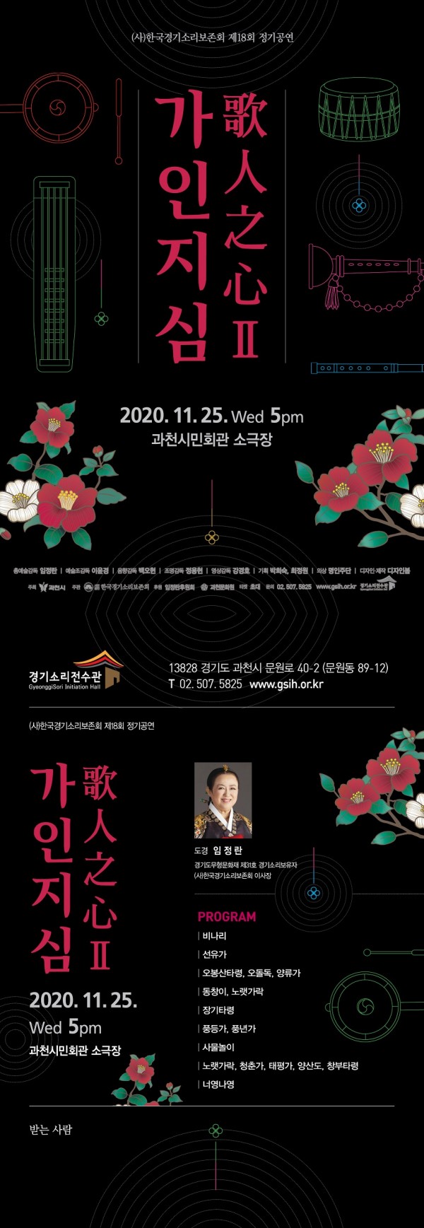 (사)한국경기소리보존회 제18회 정기공연 ‘가인지심Ⅱ’ 페이지 정보 작성자 전은정 작성일20-11-18 13:48 조회2,037회 댓글0건 이전글 다음글 목록 본문 0 댓글목록 등록된 댓글이 없습니다. 이전글 다음글 목록