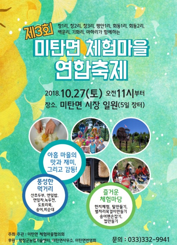미탄면 체험마을 연합축제에 초대합니다. 페이지 정보 작성자 평창문화원 작성일18-10-24 09:42 조회2,874회 댓글0건 이전글 다음글 목록 본문 많이 오셔서 체험하시고 즐기시기 바랍니다. 댓글목록 등록된 댓글이 없습니다. 이전글 다음글 목록