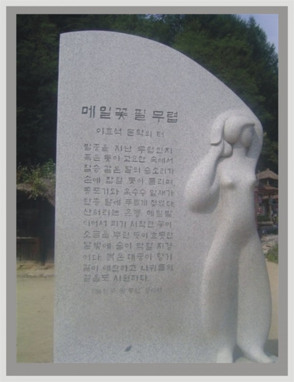 이때 달밤에 비치는 봉평 어귀의 산야에 척박한 땅에 자라는 메밀꽃 풍광을 그의 소설에서 찾아볼 수 있다.