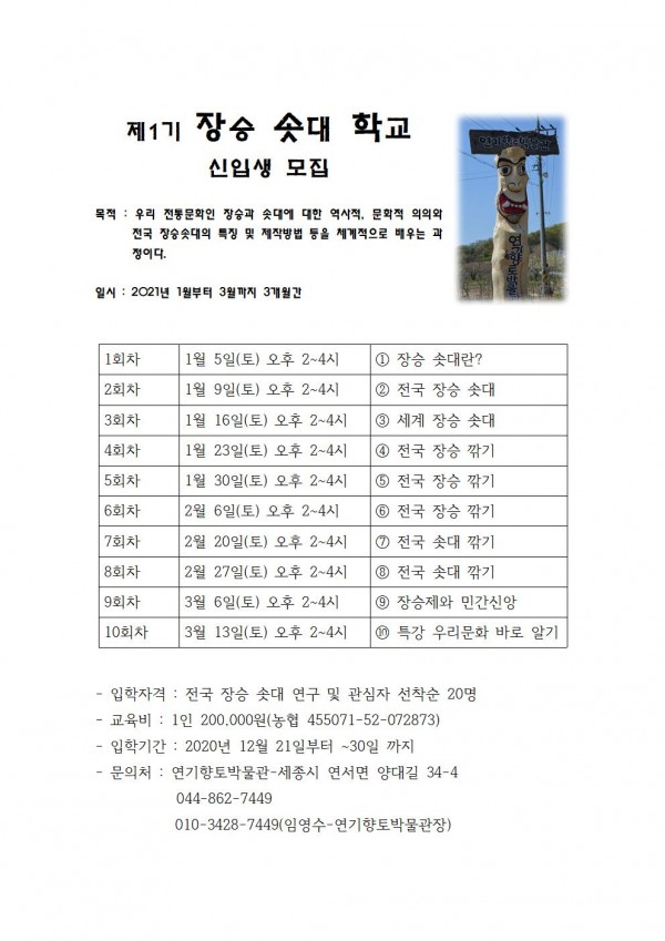 연기향토박물관에서 장승학교 신입생을 모집합니다^^ 페이지 정보 작성자 임영수 작성일20-12-23 17:31 조회1,921회 댓글0건 이전글 다음글 목록 본문 . 댓글목록 등록된 댓글이 없습니다. 이전글 다음글 목록