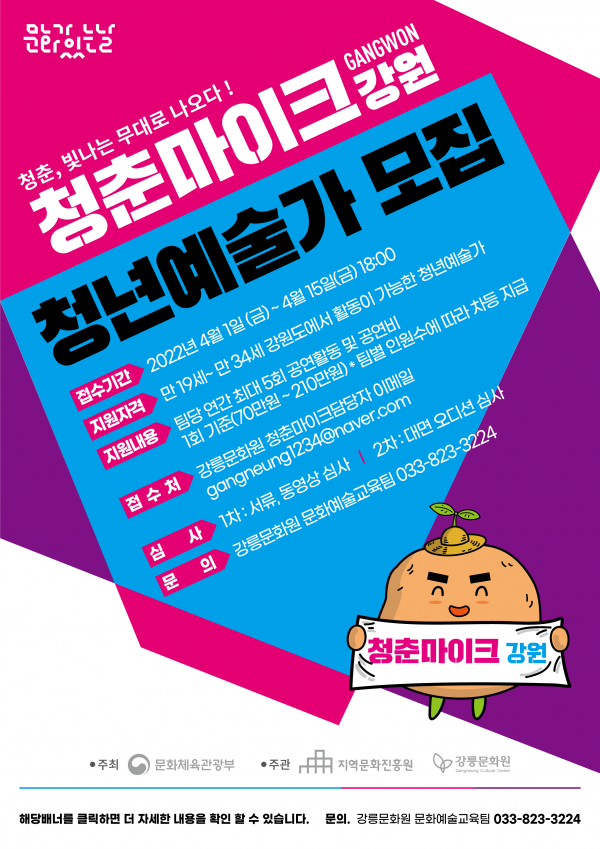 "강릉문화원 2022 문화가 있는 날 청춘마이크" 사업 홍보 페이지 정보 작성자 평창문화원 작성일22-04-04 11:38 조회1,522회 댓글0건 이전글 다음글 목록 본문 문화체육관광부에서 주최하고 지역문화진흥원과 강릉문화원에서 주관하는 "2022 문화가 있는 날 청춘마이크" 사업을 홍보하오니 많은 관심 바랍니다. 댓글목록 등록된 댓글이 없습니다. 이전글 다음글 목록