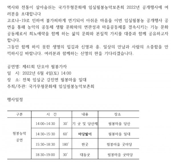 2022 국가무형문화재 임실필봉농악보존회 공개행사 알림 페이지 정보 작성자 박혜정 작성일22-05-21 15:42 조회1,480회 댓글0건 이전글 다음글 목록 본문 . 댓글목록 등록된 댓글이 없습니다. 이전글 다음글 목록