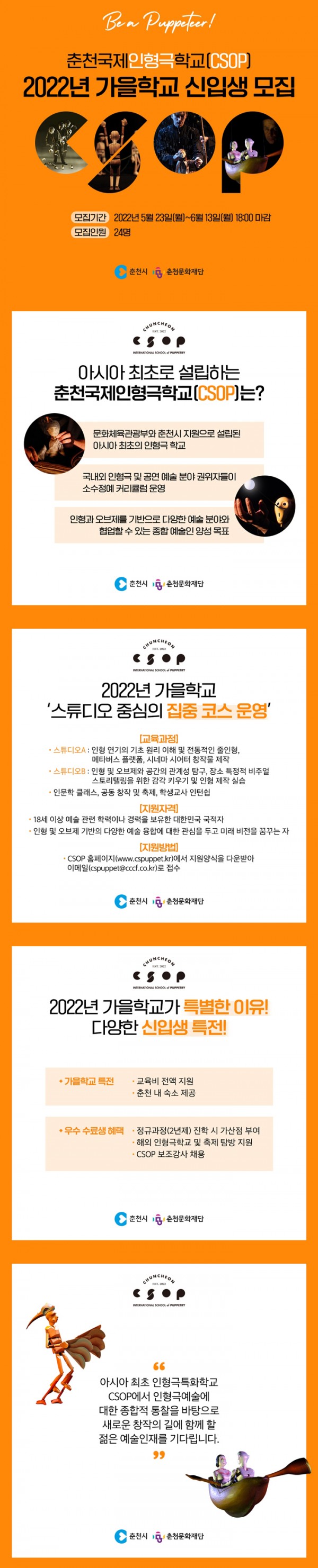 [홍보] 춘천국제인형극학교 2022 가을학교 신입생 모집 공고[학비 무료 지원 및 춘천 내 숙소 제공] 페이지 정보 작성자 김주연 작성일22-06-07 15:46 조회1,443회 댓글0건 이전글 다음글 목록 본문 . 댓글목록 등록된 댓글이 없습니다. 이전글 다음글 목록