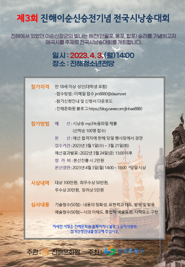 진해에서 있었던 이순신장군의 빛나는 해전의 승리를 기념하고자 애국시를 주제로 전국시낭송대회를 아래와 같이 개최합니다.