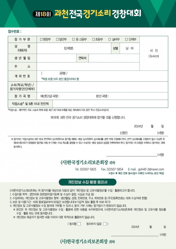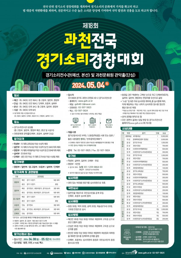 [국무총리상] 제18회 과천 전국 경기소리 경창대회 개최 (5/4) 페이지 정보 작성자 전은정 작성일24-04-17 10:38 조회1,042회 댓글0건 이전글 다음글 목록 본문 l 댓글목록 등록된 댓글이 없습니다. 이전글 다음글 목록