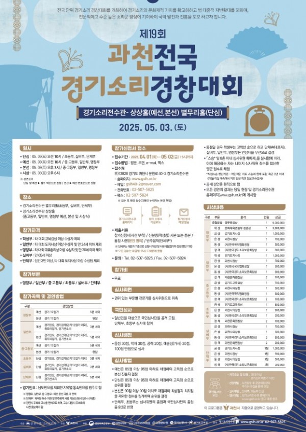 [국무총리상] 제19 과천 전국 경기소리 경창대회 참가자 모집 ㅣ접수기간 4월1일~5월2일 페이지 정보 작성자 전은정 작성일25-04-04 16:21 조회422회 댓글0건 이전글 다음글 목록 본문 1 댓글목록 등록된 댓글이 없습니다. 이전글 다음글 목록